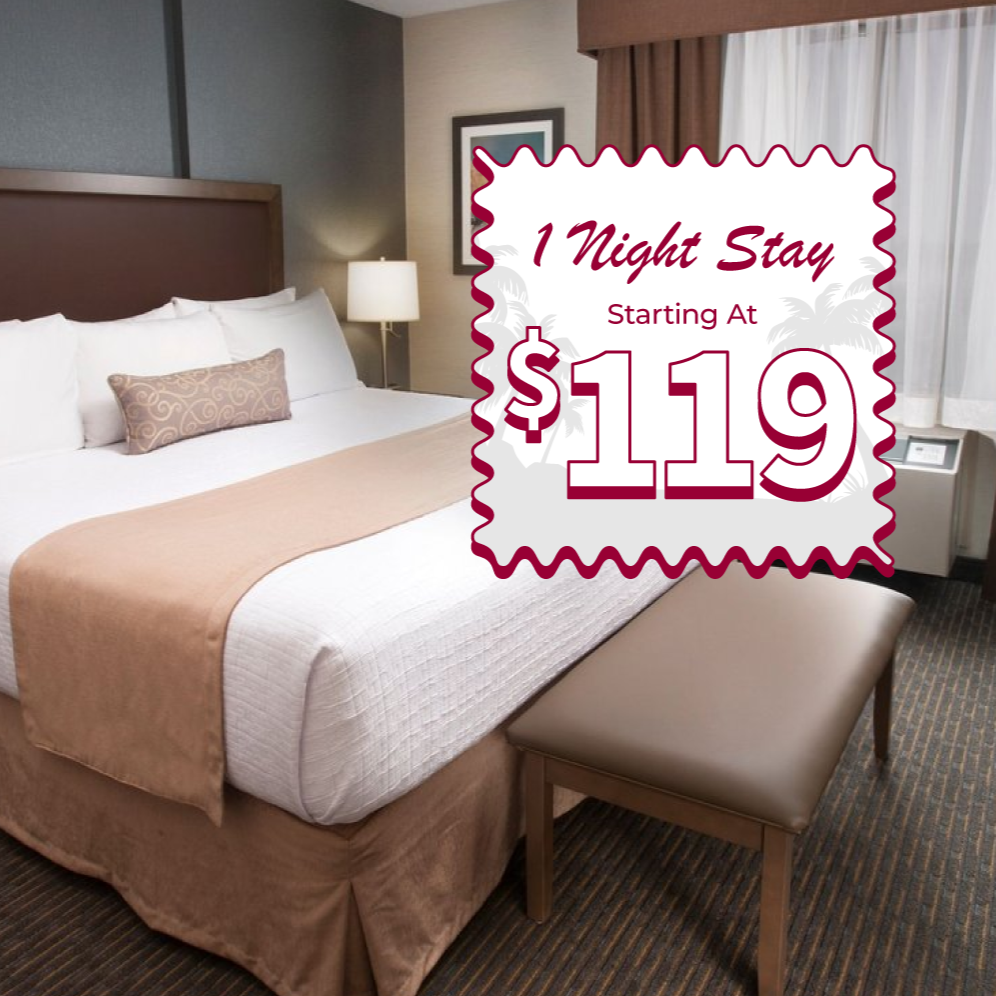 Book your Tropical Escape Package and receive exclusive perks to this package. All one-night stays will receive $50 in dining credit, $25 in arcade credit